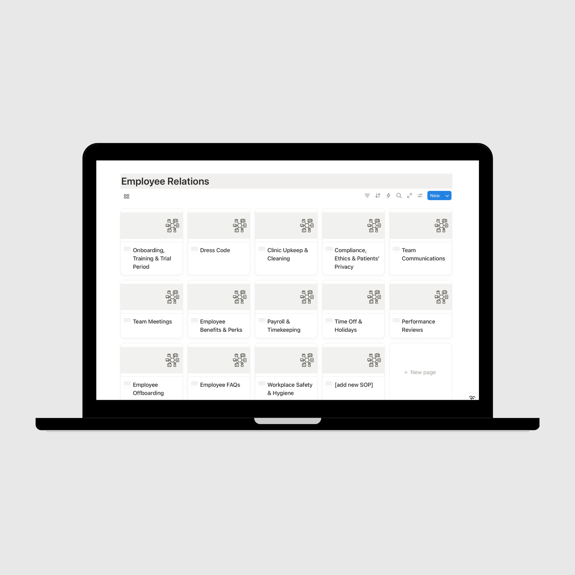 A neatly structured, ready-to-use operations manual template on Notion built for medical clinic owners who want a clean, organized, and easy-to-navigate, go-to knowledge hub for their business and team.